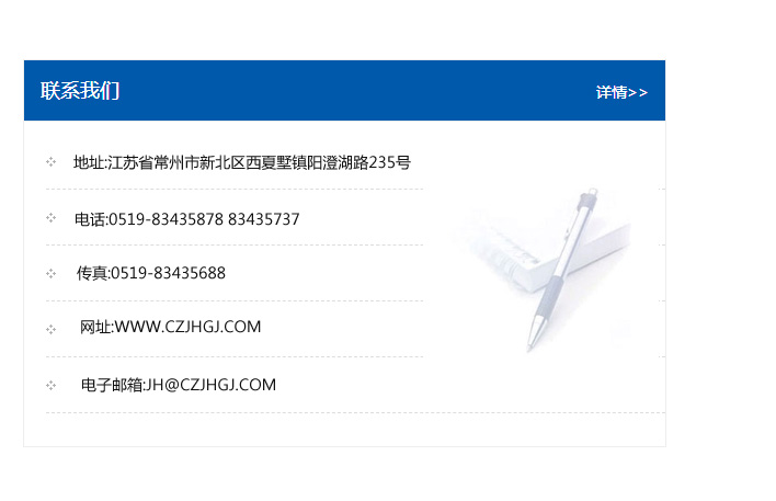 傳真:0519-83435688    郵編:213135    網址:WWW.czjhgj_com.xiyoule.com    電子郵箱:JH@czjhgj_com.xiyoule.com